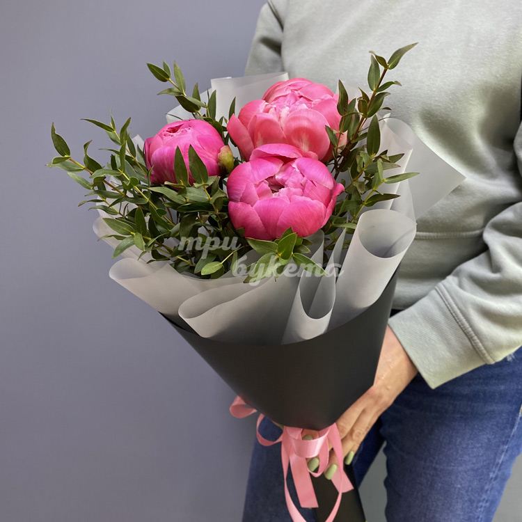 Букет из 3 розовых пионов в крафте