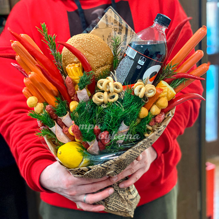 Букет с сосисками, сыром и напитком