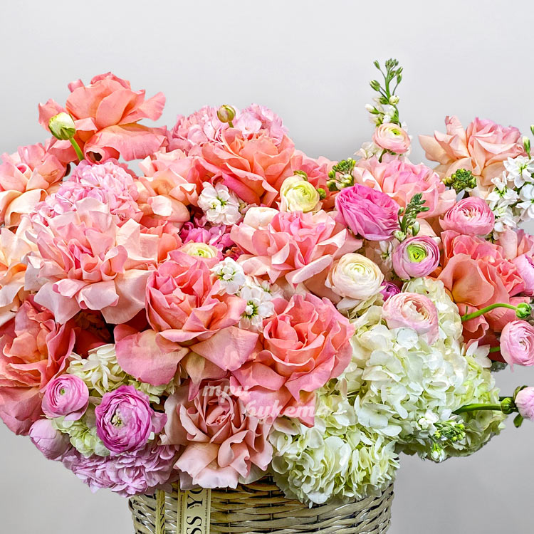 Корзина коралловых роз с гортензиями