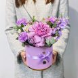 Нежно-розовые розы и эустомы в коробке