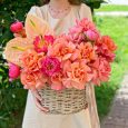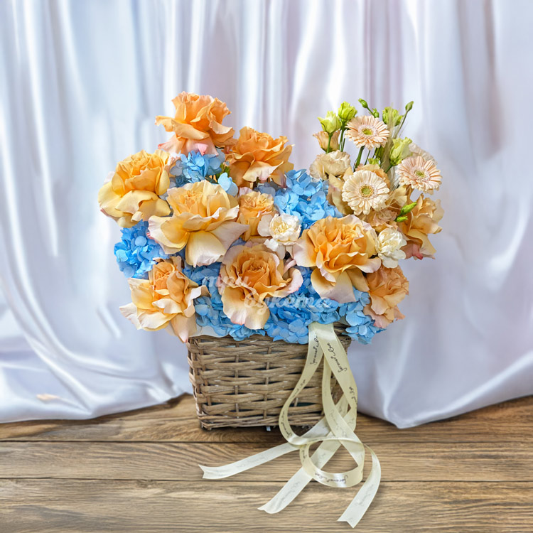 Персиковые розы с синими гортензиями в корзине