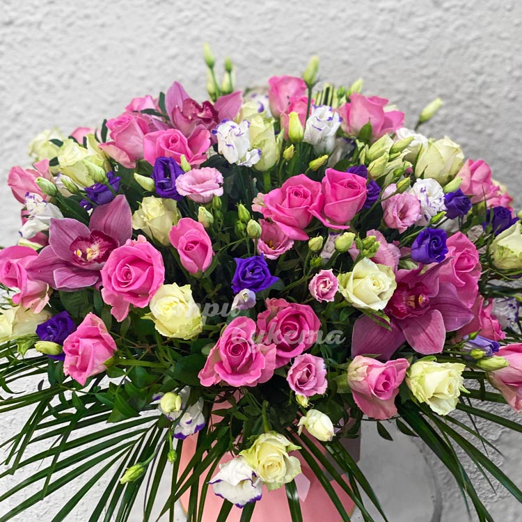 Розы и эустомы в коробке